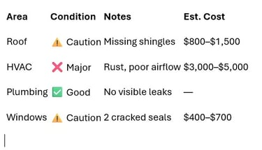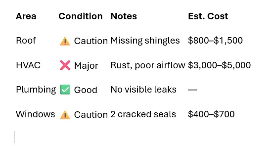 Summary: Roof and HVAC nearing end of life. Budget $5Kβ$6K for future repairs